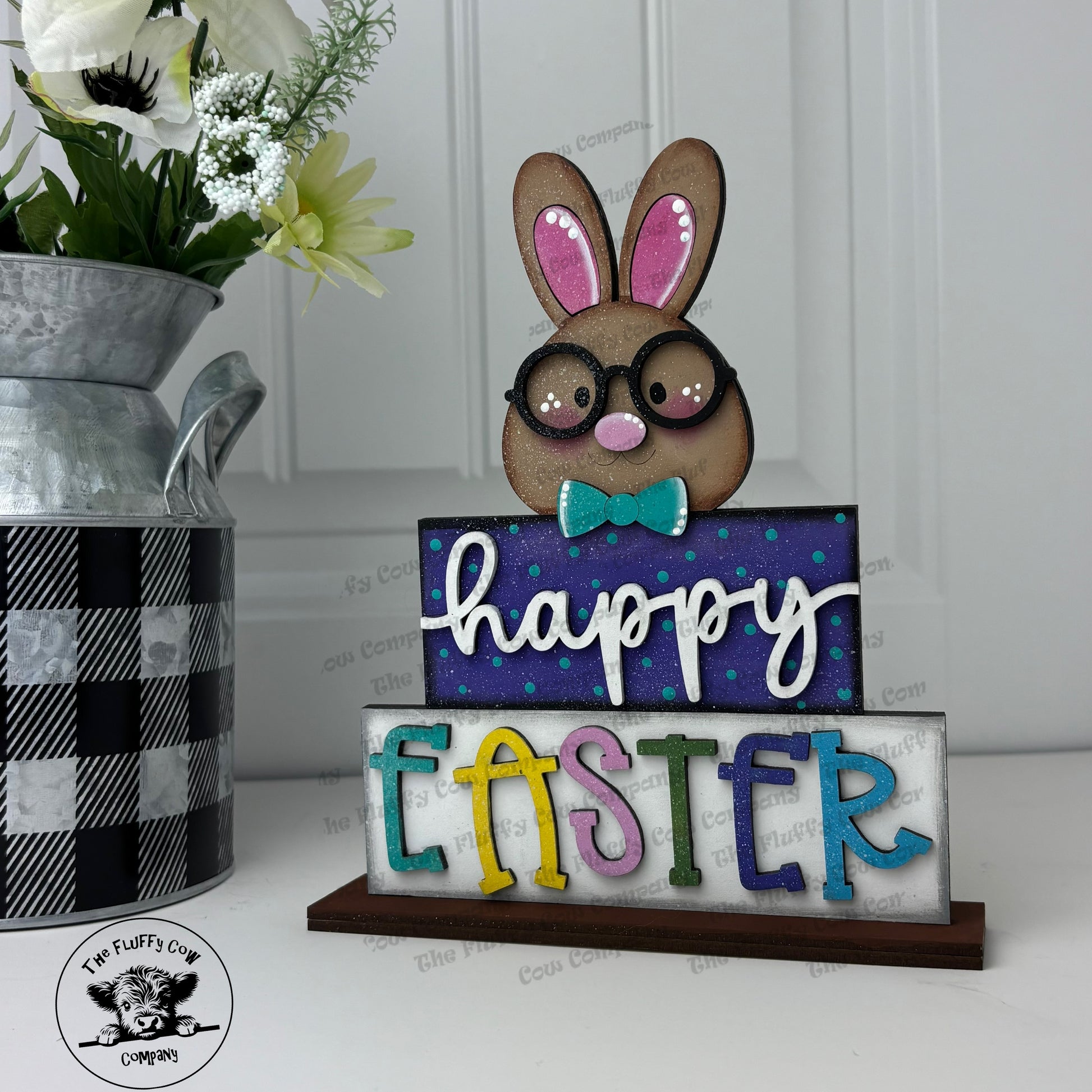 The laser-cut design and hand-painted details showcase expert craftsmanship. Complete with a bunny wearing glasses, this charming Easter decor is a perfect addition to your holiday celebrations.
