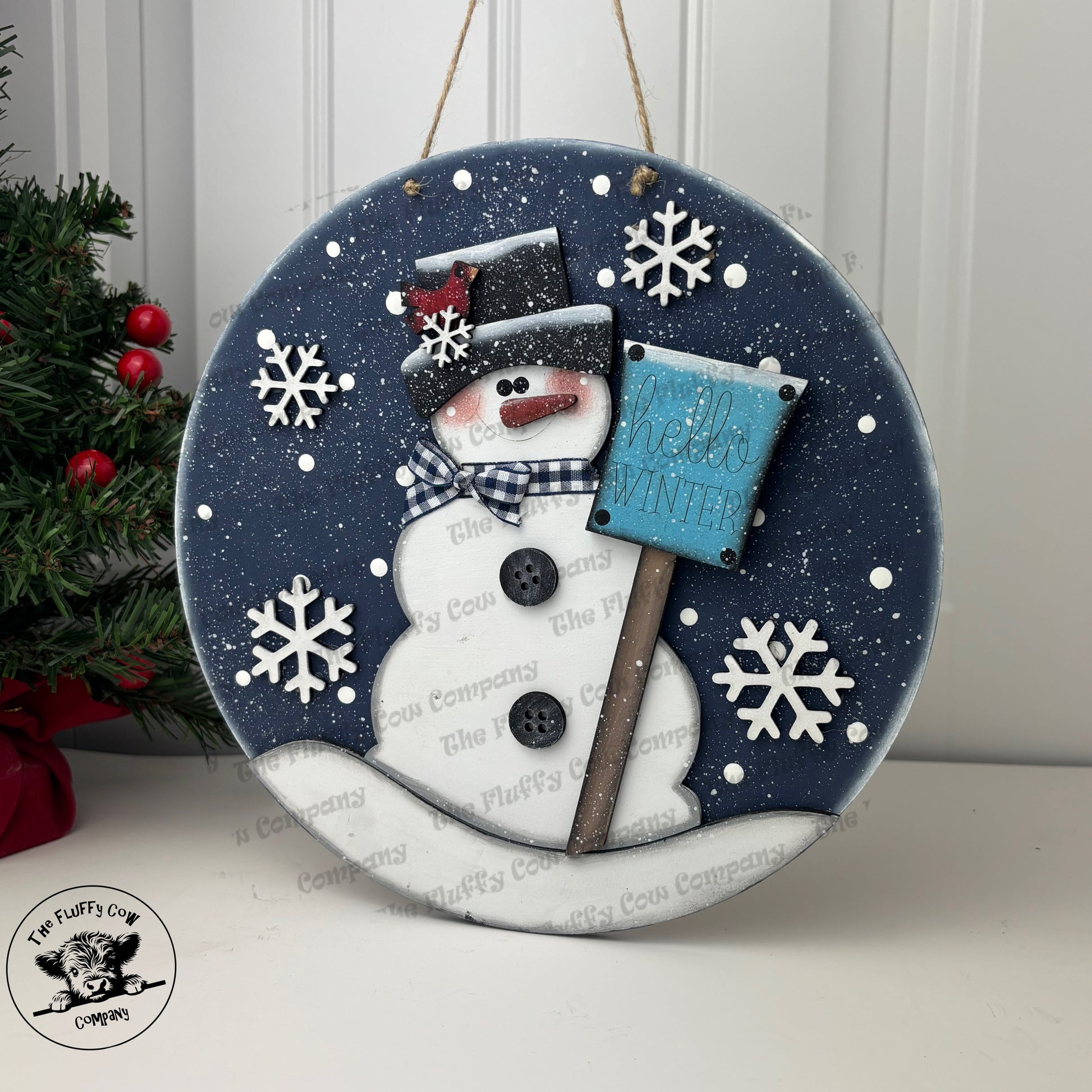 Expertly crafted in Alberta, Canada, the Hello Winter Snowman Disc Wall Hanging adds a charming touch to your home decor. Hand-painted and laser-cut, this unique piece showcases the beauty of winter with a playful snowman design. Bring the winter wonderland indoors with this beautiful and one-of-a-kind wall hanging. Hangs by string.