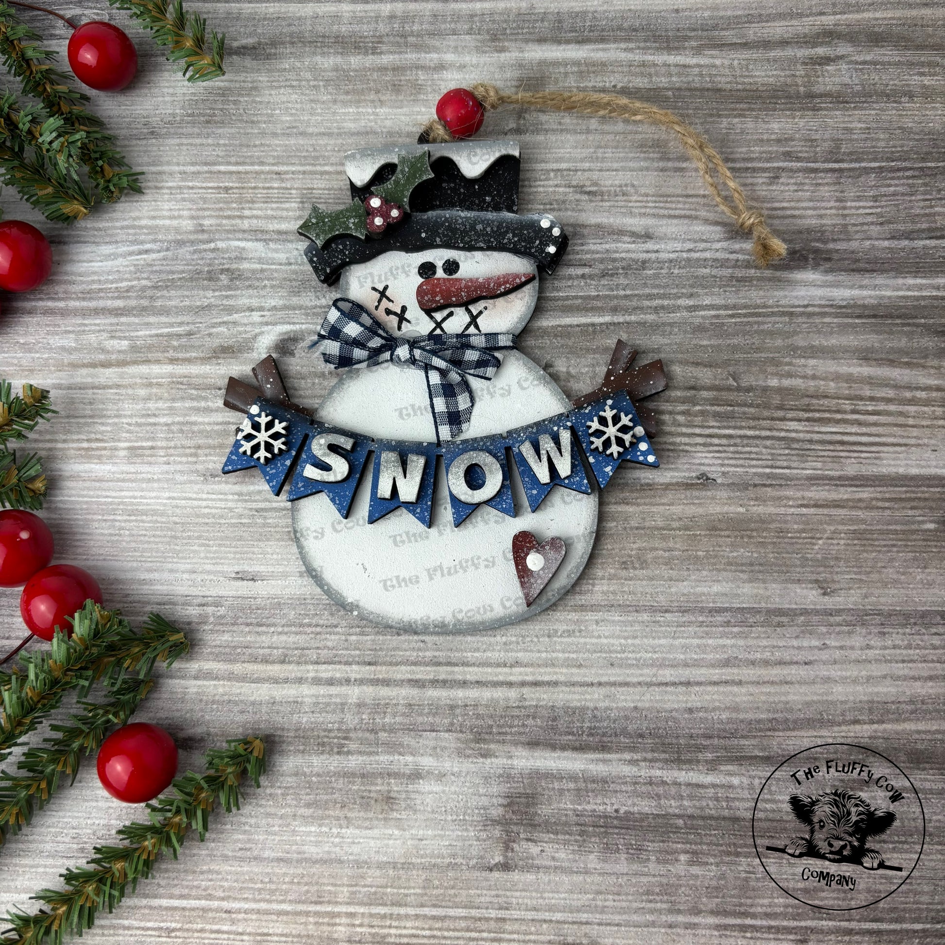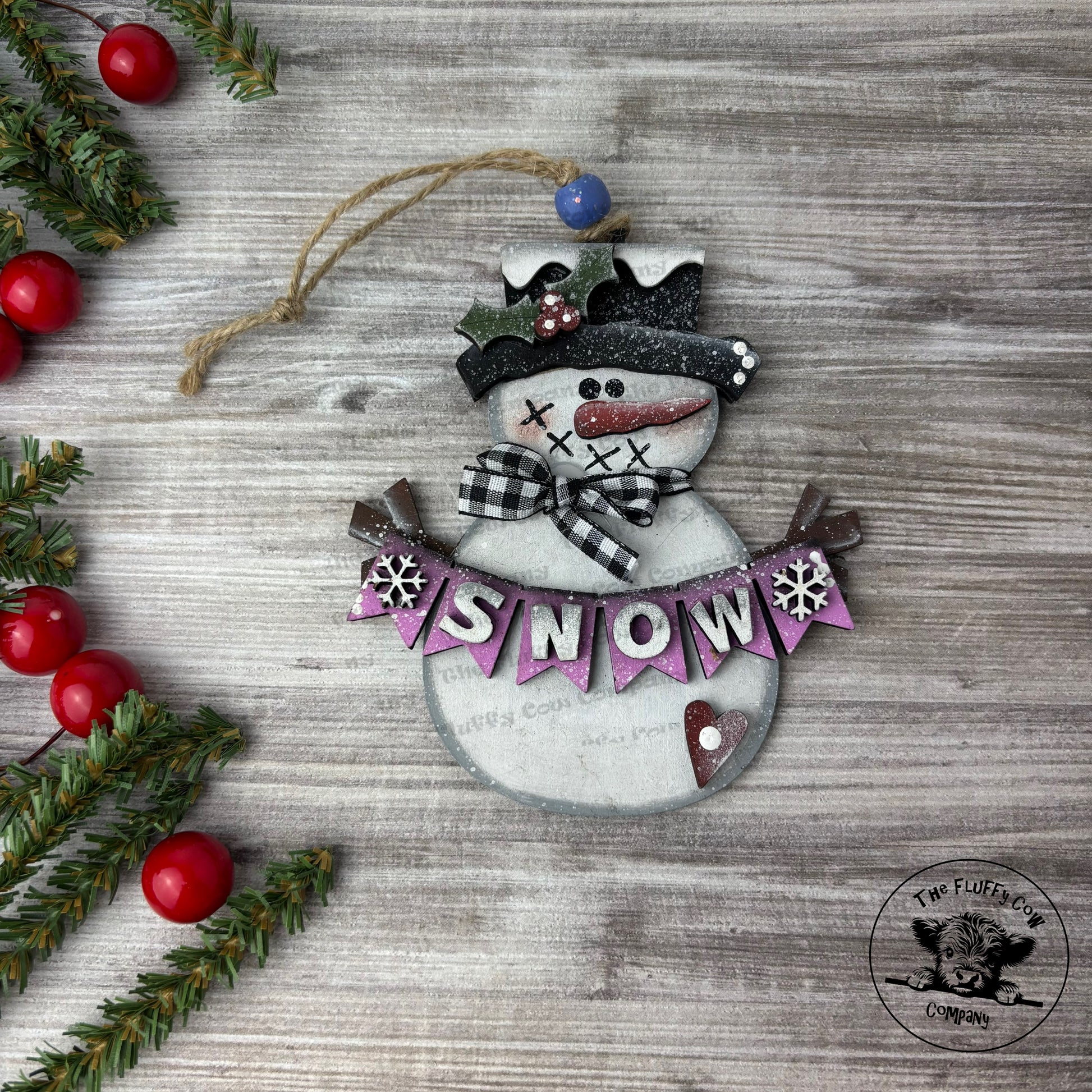This Snowman Holding Banner Christmas Ornament is hand painted and cut with a laser in Alberta, Canada. Crafted with precision and care, it is a perfect addition to your holiday decor. Show off your festive spirit with this unique and expertly made ornament.