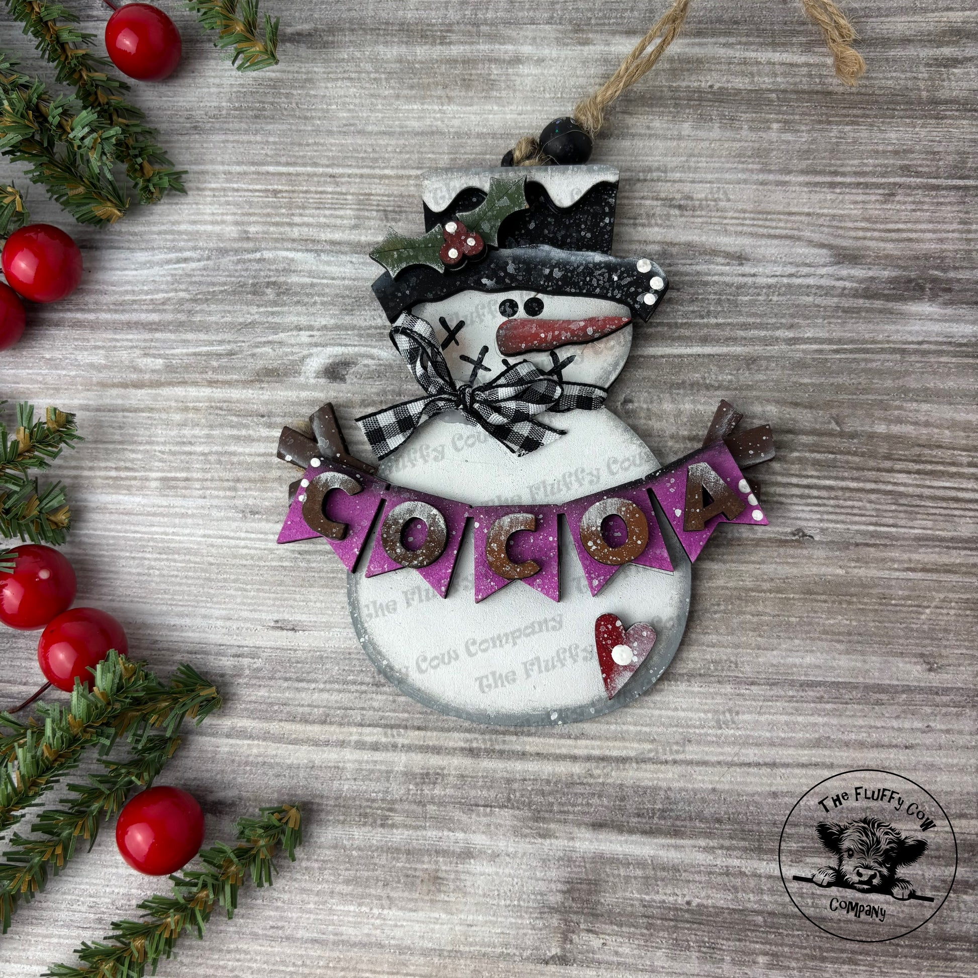 This Snowman Holding Banner Christmas Ornament is hand painted and cut with a laser in Alberta, Canada. Crafted with precision and care, it is a perfect addition to your holiday decor. Show off your festive spirit with this unique and expertly made ornament.