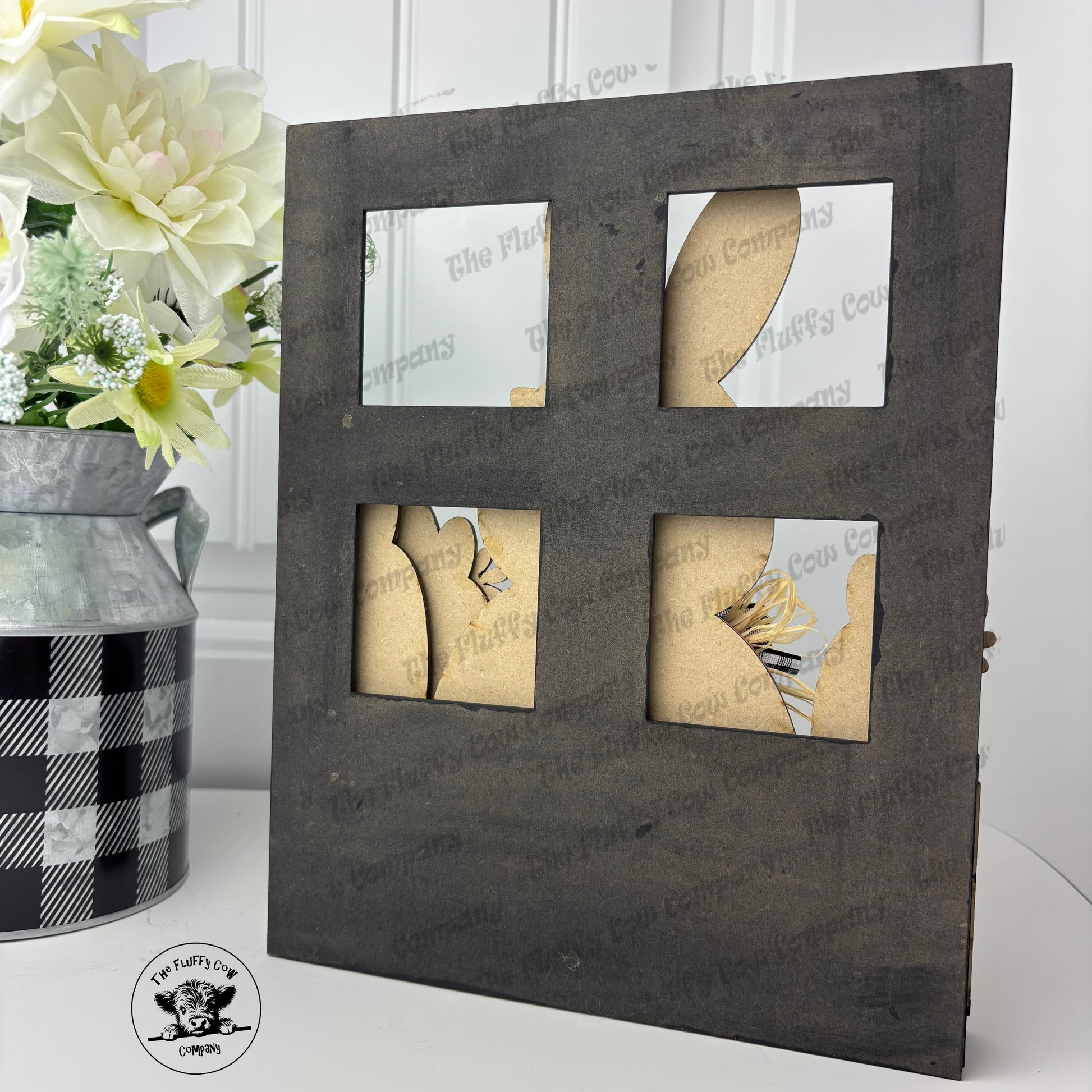 This hand-crafted Window Frame Shelf Sitter comes with a seasonal Easter Blessing Bunny insert. The laser-cut design and painted details provide a charming addition to your home decor.